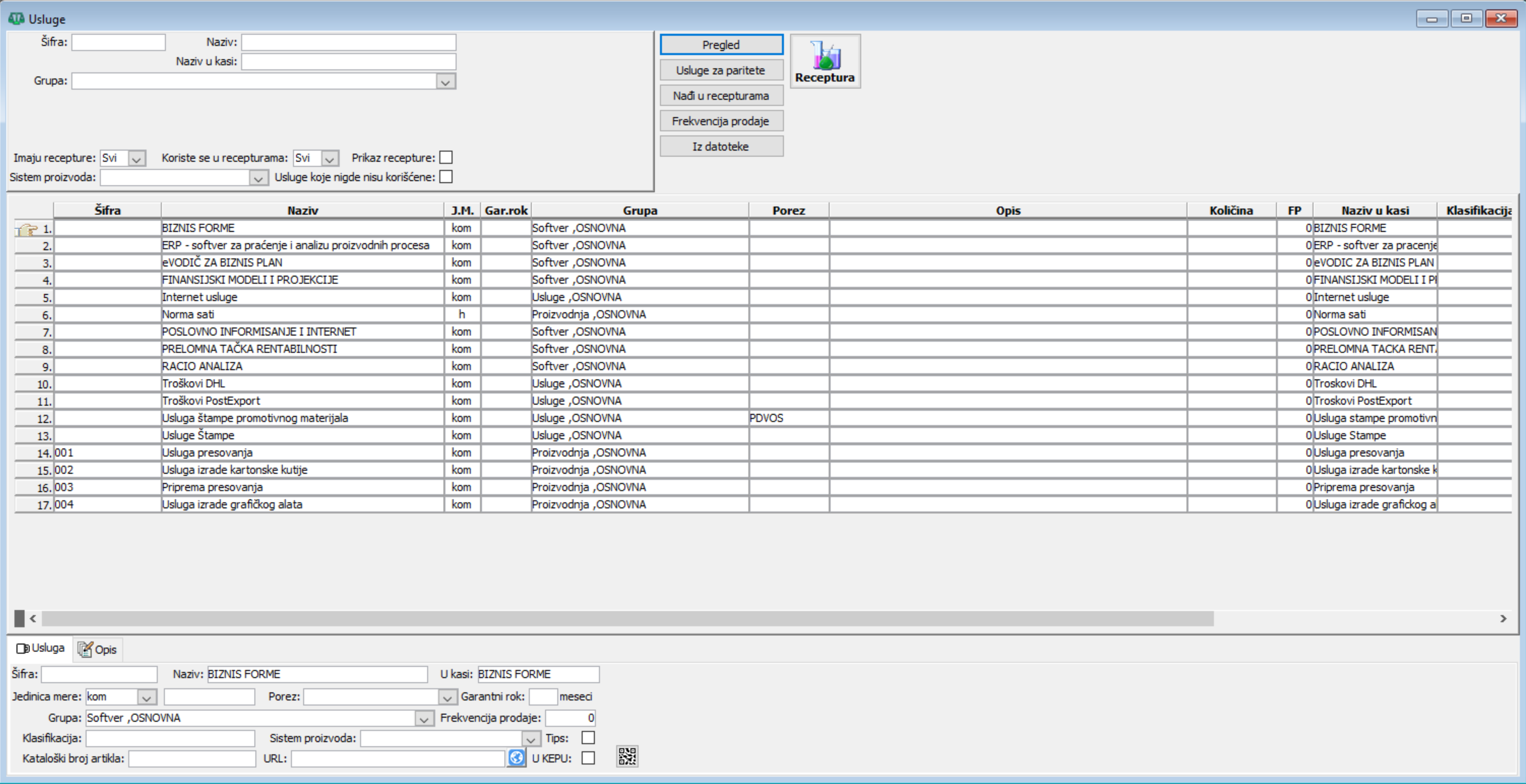 Klikom na dugme "Receptura" otvara se prozor za definisanje recepture iz kojih se radnji sastoji usluga koju smo uneli ili unosimo kao i šta je još eventualno potrebno od artikala da bi usluga bila kompletna. Ovaj prozor u sebi sadrži filter uz pomoć koga se može dobiti pregled recepture za određenu uslugu sa dugmadima za prenumeraciju, kopiranje i pregled, deo za zbirni pregled i unos određenih sastavnih operacija i elemenata neke usluge ( vidi sliku )