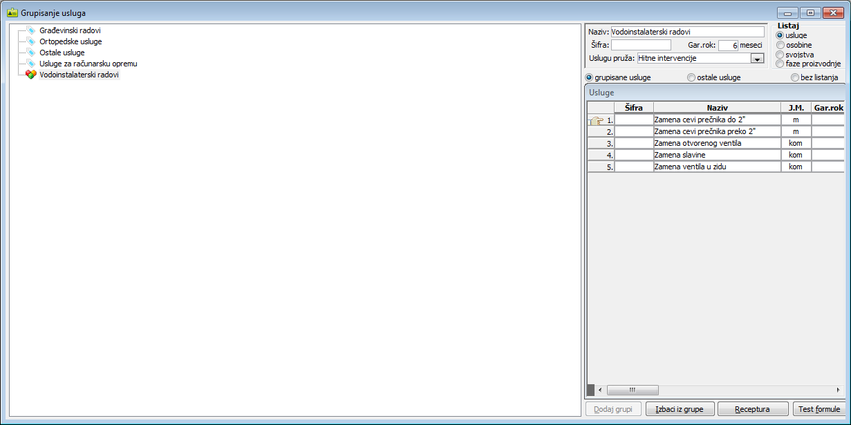Klikom na dugme "Test formule" proveraju se postojeće formule za recepture grupe usluga koje pripadaju određenoj grupi usluga istovetno grupama artikala, što je objašnjeno u prozoru "Artikli" - Test formule.