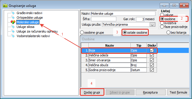 Osobine se dodaju grupi tako što se selektuje grupa iz stabla kojoj želite dodeliti određene osobine, potvrdi se stavka radio menija "Osobine" u sekciji "Listaj", zatim se potvrdi stavka radio menija "Ostale osobine", selektuje osobina ili više njih i klikom na dugme "Dodaj grupi" dodele grupi usluga ( vidi sliku )