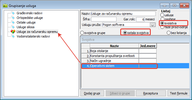 Na potpuno isti način je moguće za selektovanu grupu usluga definisati i određena svojstva. Svojstva se dodaju grupi tako što se selektuje grupa iz stabla kojoj želite dodeliti određene svojstva, potvrdi se stavka radio menija "Svojstva" u sekciji "Listaj", zatim se potvrdi stavka radio menija "ostala svojstva", selektuje svojstvo ili više njih i klikom na dugme "Dodaj grupi" dodele grupi ( vidi sliku )