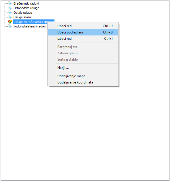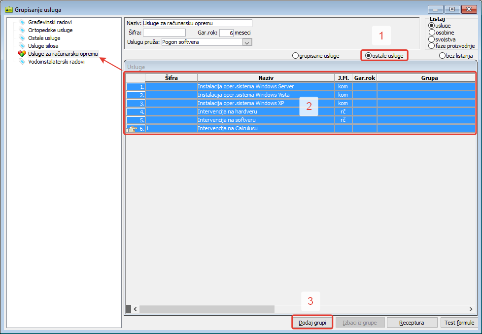 Usluge se dodaju grupi usluga tako što se selektuju usluge iz spiska usluka koji ne pripadaju nijednoj grupi klikom na radio dugme "Ostale usluge" a zatim klikom na dugme "Dodaj grupi" dodele selektovanoj grupi usluga ( vidi sliku )