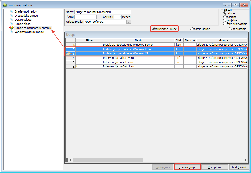 Usluge se izbacuju iz grupe tako što se selektuje grupa usluga u stablu, klikne na radio dugme "Grupisane usluge" i selektuju usluge koje treba izbaciti iz selektovane grupe. Klikom na dugme "Izbaci iz grupe" izbacujete selektovane usluge iz grupe ( vidi sliku )