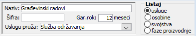 U "Editor grupe usluge" se unose podaci za jednu grupu usluga koju unosimo ili ažuriramo i to: naziv u polje "Naziv:", šifra u polje "Šifra:", vreme trajanja garancije u polje "Gar.rok.:" u mesecima i naziv organizacione jedinice koja pruža uslugu u polje "Uslugu pruža:". Editor grupe usluge omoućuje pregled i dodavanje osobina, svojstava i faza proizvodnje grupi usluge.