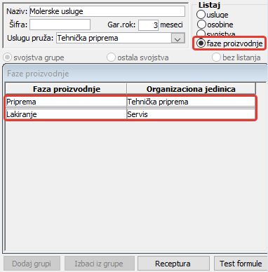 Klikom na dugme "Receptura" otvara se prozor "Receptura za: (naziv grupe usluga)". U ovom prozoru definišete stavke recepture grupe koje će biti primenjene zajedno sa stavkama receptura definisanim za svaku pojedinačnu uslugu koji je dodeljena toj grupi. U stavkama vrste radnog naloga definisanog u podacima proizvodnje za konkretnu uslugu iz grupe klinite na dugme "Karakteristike".