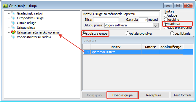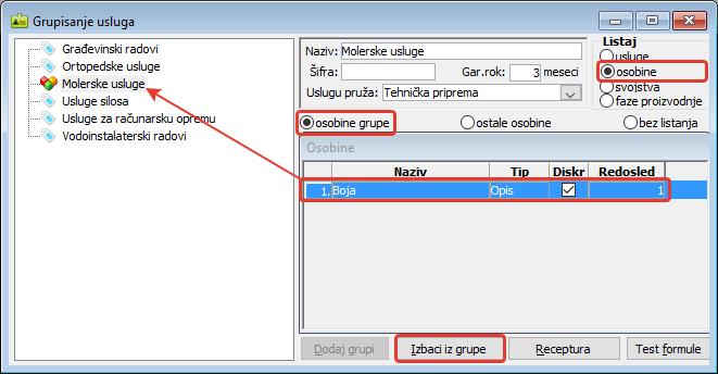 Osobine se izbacuju iz grupe tako što se selektuje u stablu grupa iz kojih treba izbaciti osobinu/e, potvrdi se stavka radio menija "Osobine" u sekciji "Listaj", potvrdi radio dugme "Grupisani artikli" i selektuje osobina ili osobine koje treba izbaciti i izbace iz grupe usluga klikom na dugme "Izbaci iz grupe" ( vidi sliku )