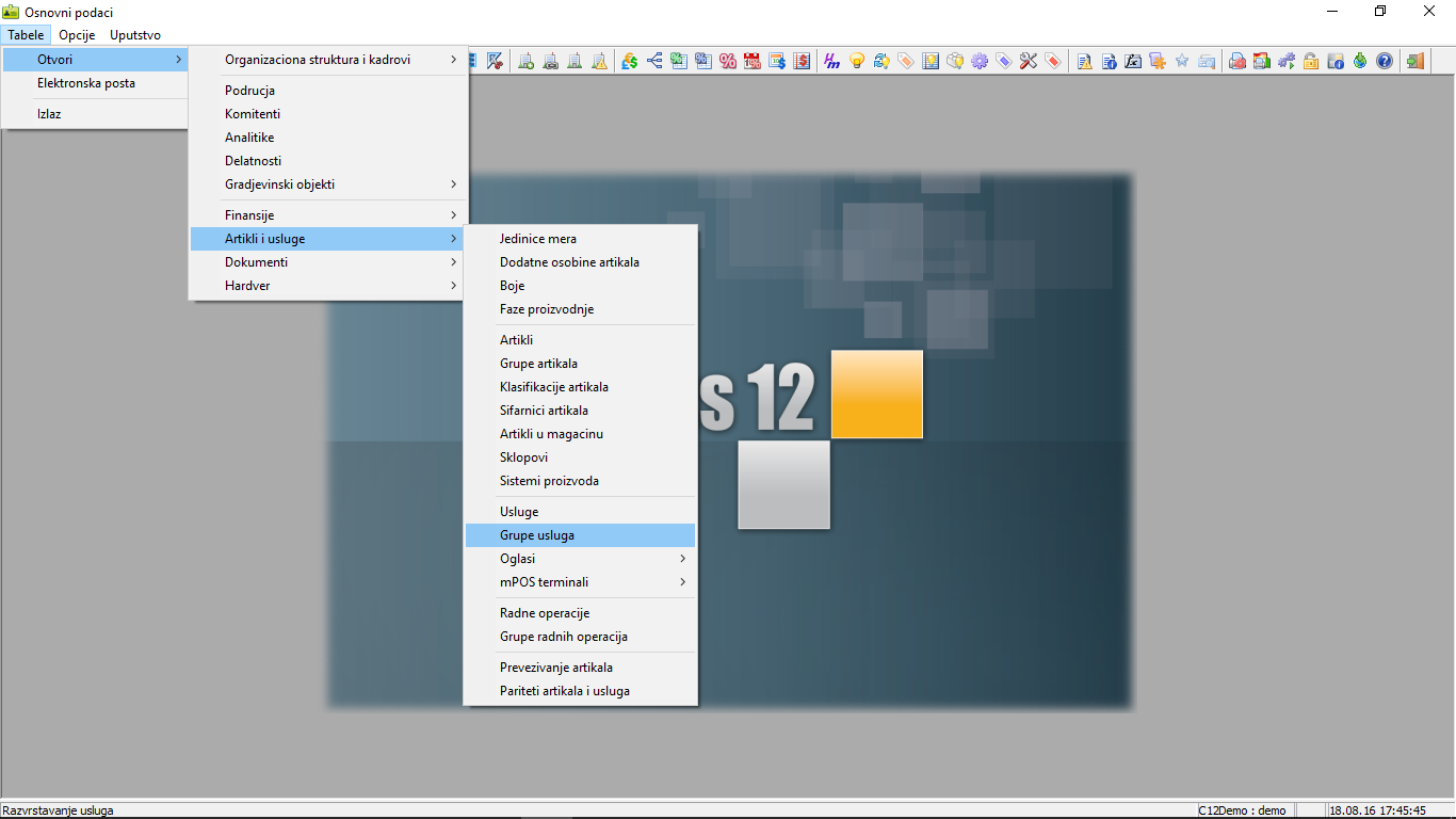 ili klikom na ikonu osnovnog menija "Grupe usluga"