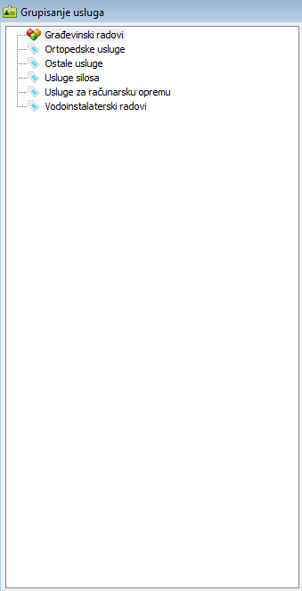 Prozor "Grupe usluga" koristite da grupišete usluge koje su delatnost preduzeća. U preduzećima često postoji potreba za zbirnim pregledima određenih usluga koji iako različite, po određenom kriterijumu, pripadaju istoj grupi usluga ( vidi sliku )