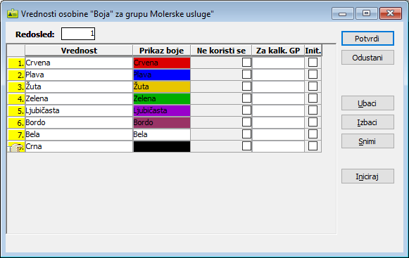 . Klikom na dugme "Iniciraj" mogu se odjednom učitati sve osobine koje može imati određena grupa usluga. Klikom na dugme "Potvrdi" potvrđuje se odabir određene osobine, klikom na dugme "Odustani" prekida se operacija odabiranja, klikom na dugme "Ubaci" može se ukoliko se želi ubaciti nova osobina, klikom na dugme "Izbaci" izbaciti već uneta osobina, klikom na dugme "Snimi" snima se konačni izbor osobina grupe usluga.