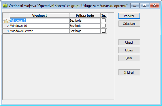 Opseg vrednosti svojstva dodeljuje se pozivanjem prozora "Vrednosti svojstva" duplim levim klikom miša na kolonu "Naziv" svojstva ( vidi sliku )