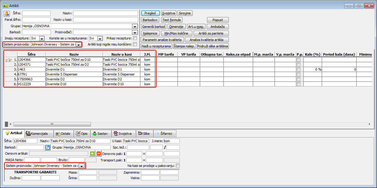 Sistem definisan u prozoru "Sistemi proizvoda" koristi se u prozoru "Artikli" u listiću "Artikal" gde se unosi u polje "Sistem proizvoda:" kako bi mu se dodelili proizvodi koji mu po specifikaciji ili deklaraciji pripadaju. ( vidi sliku )