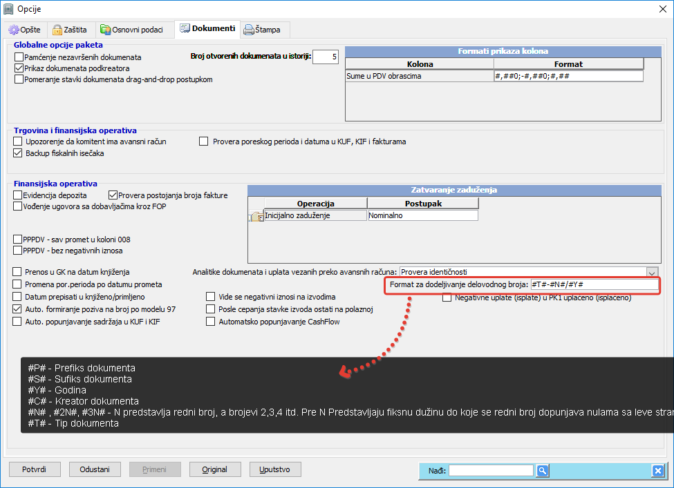 Format delovodnog broja definišete u "Opcijama programa" programa Finansijska operativa u listiću "Dokumenti" (vidi sliku)