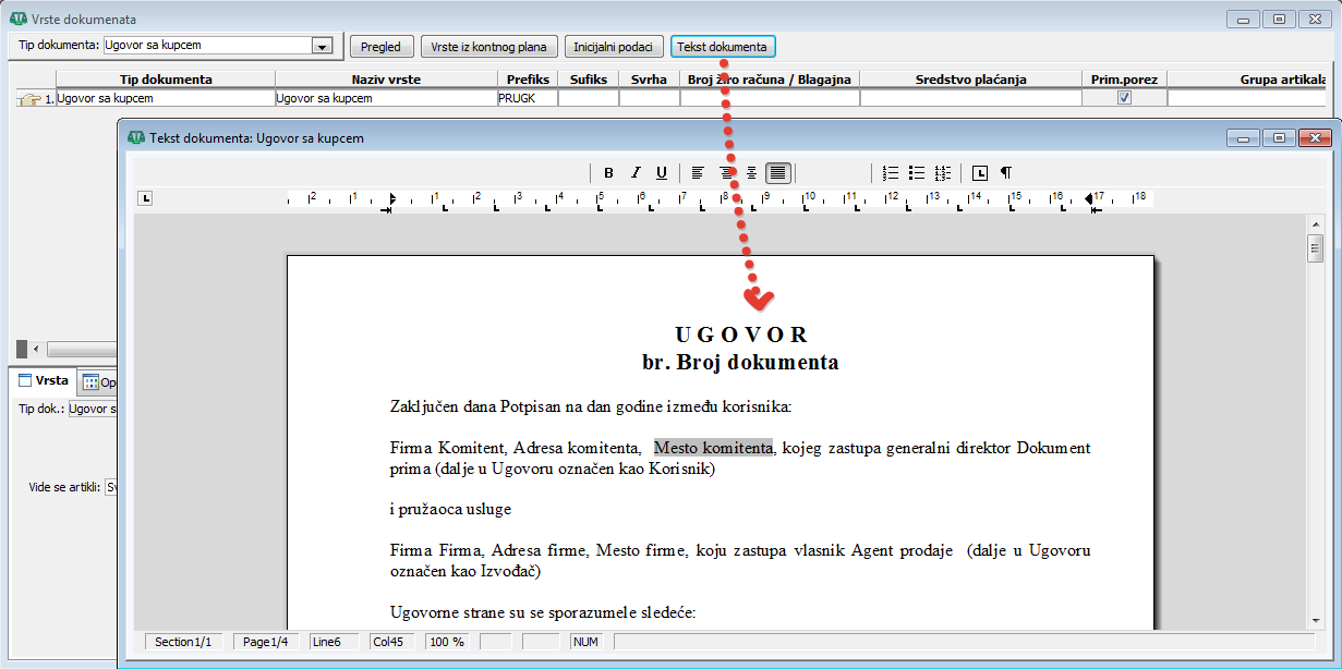 Klikom na dugme "Tekst dokumenta" u vrstama dokumenata otvara se prozor za editiovanje teksta, npr. kod ugovora sa kupcima. Omogućava definisanje šablona za tekst dokumenta za štampu za vrstu dokumenta. Koristi se pri formiranju određenih vrsta rešenja npr. "Rešenje o godišnjem odmoru", "Rešenje o postavljenju" na određeno radno mesto i sl. i moguće ga je koristiti samo kod određenih vrsta dokumenata. Prozor za editiovanje teksta se otvara i iz ugovora, gde konkretan ugovor može dodatno da se edituje.