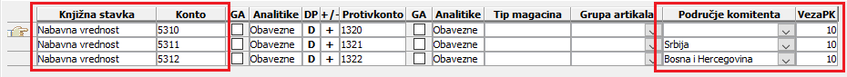 Ako područja navedena u knjižnim stavkama jedne grupe obuhvataju sve komitente, u kolonu "VezaPK" nije potrebno unositi ništa. U suprotnom, mora se definisati i knjižna stavka za sve ostale komitente (ostala područja), u kojoj se kolona "Područje komitenta" ostavlja prazna, a u svim knjižnim stavkama te grupe mora se uneti isti broj. Knjižna stavka sa praznom kolonom "Područje komitenta" koristi se i za komitente na kojima nije definisano mesto. U primeru prikazanom na slici, nabavna vrednost za komitente iz Srbije se knjiži na konto 5311, za komitente iz BiH na konto 5312, a za sve ostale komitente na konto 5310. Kada bi firma poslovala samo sa komitentima iz Srbije i BiH, ne bi bilo potrebno definisati knjižnu stavku sa praznom kolonom "Područje komitenta", a u kolonu "VezaPK" ne bi bilo potrebno unositi nikakve brojeve.