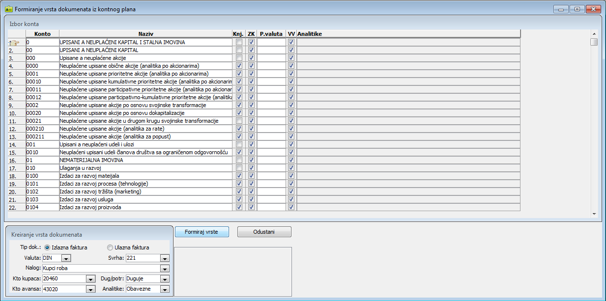 Klikom na dugme "Vrste iz kontnog plana" ulazi se u kontni plan iz koga je moguće direktno kreirati nove vrste dokumenata (vidi sliku)
