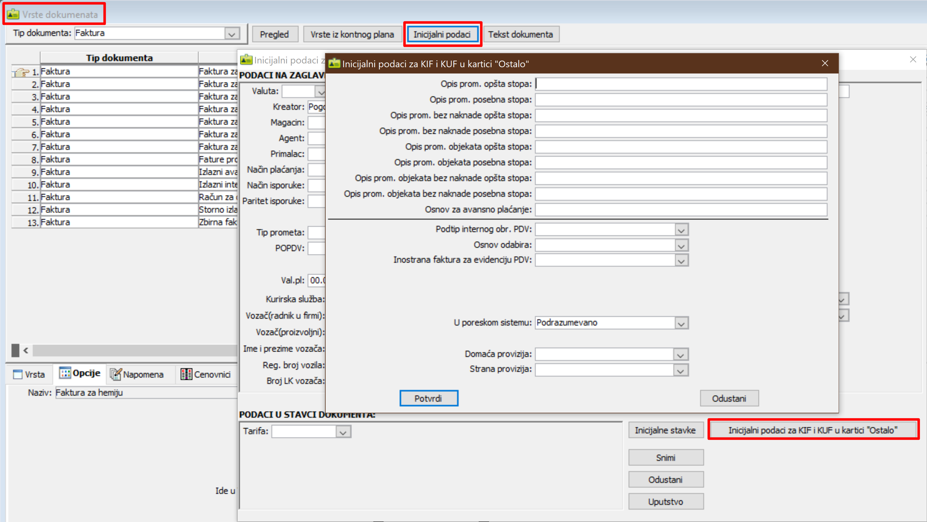 Klikom na dugme "Inicijalni podaci za KIF i KUF u kartici "Ostalo"" za iniciranu vrstu dokumenta otvara se istoimeni prozor "Inicijalni podaci za KIF i KUF u kartici "Ostalo"" (vidi sliku)