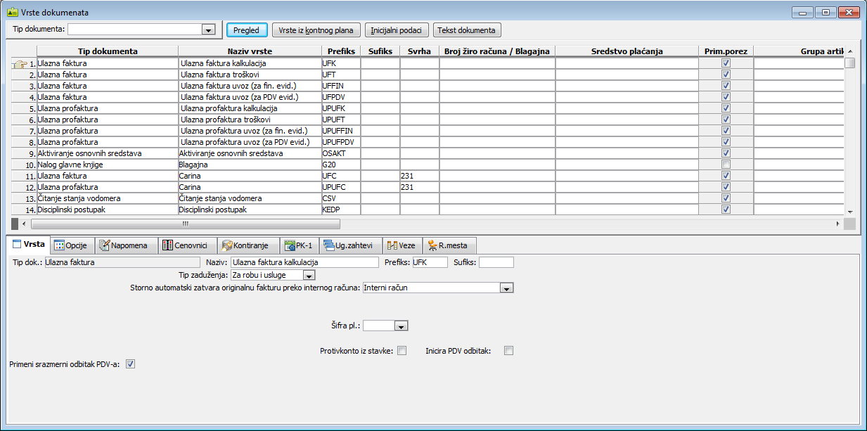 Vrste dokumenata..U drugoj oblasti prozora "Vrste dokumenata" izlistava se pregled već postojećih vrsta dokumenata zbirno ili grupisano po izabranom tipu dokumenta. U ovom delu se vrši i brisanje i unos novih vrsta dokumenata na način kako je to opisano u poglavljima: