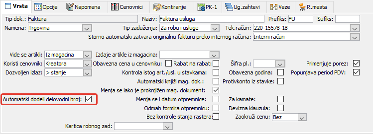 Ukoliko želite da se delovodni brojevi automatski dodeljuju dokumentima potrebno je da podesite sledeće opcije: