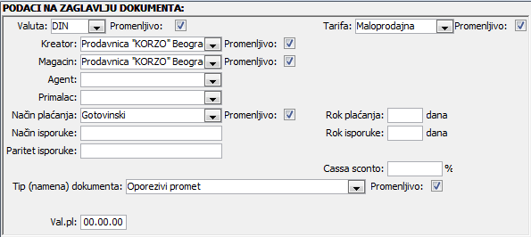 U sekciji prozora "Inicijalni podaci za vrstu dokumenta:" pod nazivom "PODACI NA ZAGLAVLJU DOKUMENTA:" moguće je inicijalizovati unos sledećih podataka u zaglavlje dokumenta: "Valuta:", "Kreator:", "Magacin:", "Agent prodaje:", "Primalac:", "Način plaćanja:", "Način isporuke:", "Peritet isporuke:", "Tarifa:", "Rok plaćanja:", "Rok isporuke:", "Cassa sconto:", "Tip (namena) dokumenta:" i valuta plaćanja "Val.pl.:" (vidi sliku)