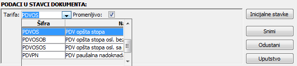U sekciji pod nazivom "PODACI U STAVCI DOKUMENTA:" moguće je inicijalizovati poreske tarife, polje "Tarife:" (vidi sliku)