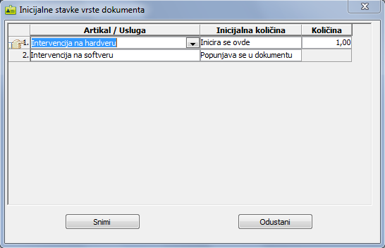 . Prozor sadrži kolone: "Artikal/usluga" za izbor artikala ili usluga koji će biti inicijalizovani prilikom svakog kreiranja vrste dokumenta, "Inicijalna količina" za izbor predefinisanih opcija načina popunjavanja količine u inicijalizovanoj stavci vrste dokumenta i "Količina" koju će biti moguće navesti u ovom prozoru samo ukoliko je odabrana opcija "Inicira se ovde".
