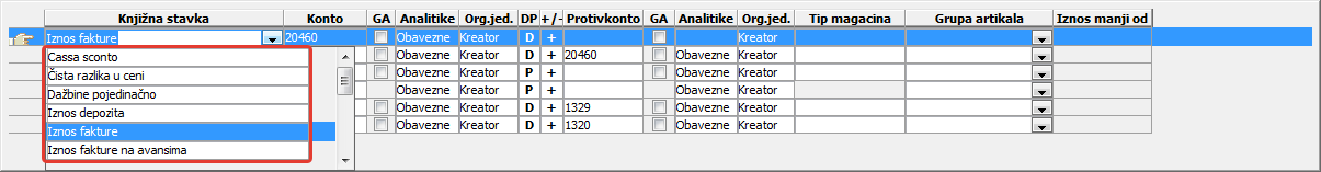 ;Kolona "Nalog glavne knjige" - izberite predefinisanu vrstu naloga glavne knjige koji će na osnovu primenjene kontne šeme biti formiran u glavnoj knjizi, (vidi sliku)