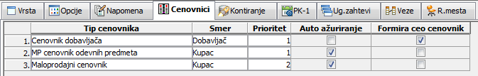 Listić "Cenovnici" - služi za unos tipova cenovnika koji se vezuju za određenu vrstu dokumenta. Za dati tip cenovnika unose se (vidi sliku)