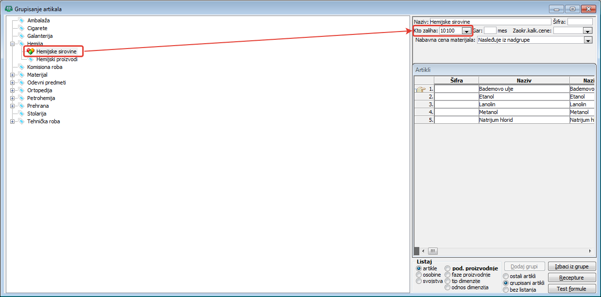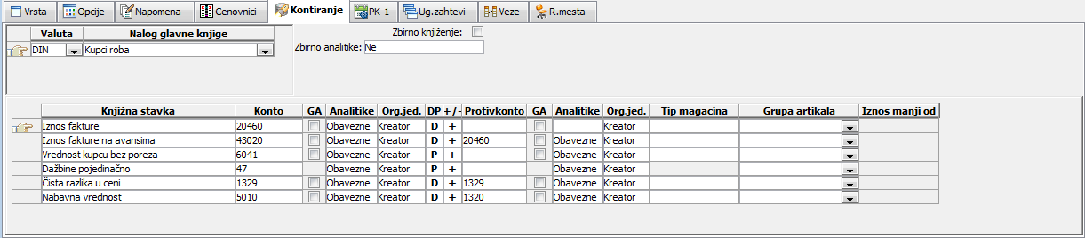 "Grupa artikala" - omogućuje knjiženje iste knjižne stavke na različita konta finansijske iznose koji se dobijaju sabiranjem iznosa stavki vrste dokumenta koji pripadaju istoj izabranoj grupi artikala;