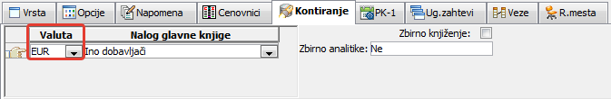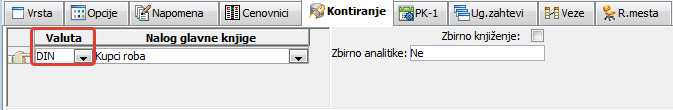 u kojoj se knjiži nalog u glavnu knjigu u skladu sa valutom vrste dokumenta (DIN, RUB, EUR...) (vidi sliku)
