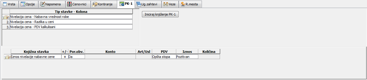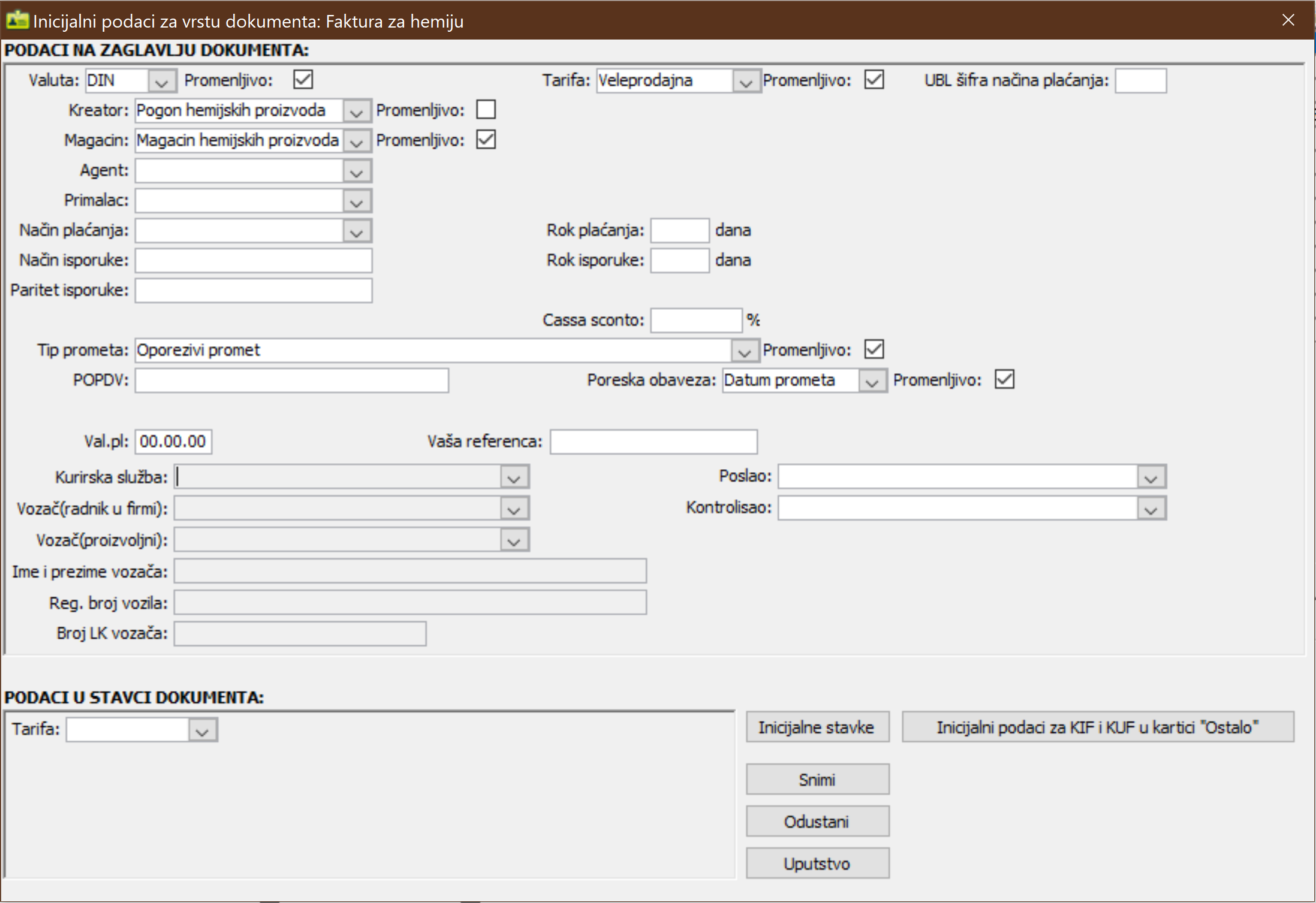 Klikom na dugme "Inicijalne stavke" za iniciranu vrstu dokumenta otvara se prozor "Inicijalne stavke vrste dokumenta" (vidi sliku)