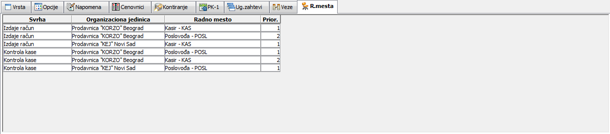 ;"Prior." - u slučaju da za istu vrstu dokumenta odgovorno može biti više radnih mesta, postavlja se prioritet odgovornosti. Cifra 1 predstavlja najveći prioritet;