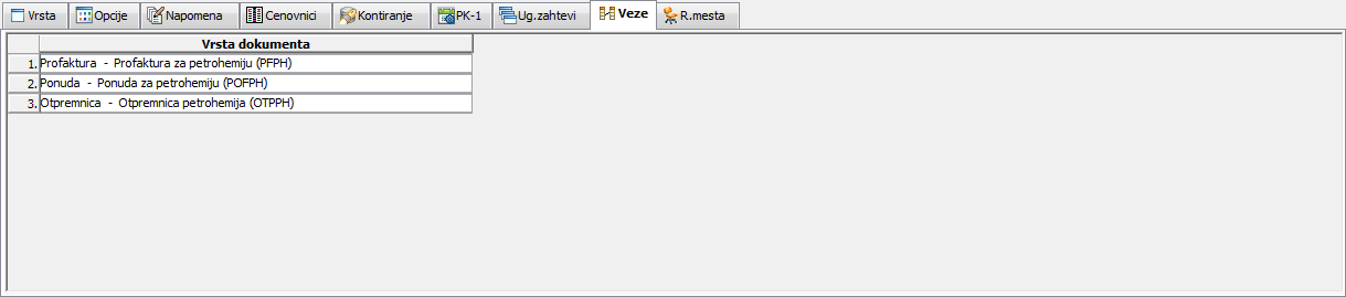 Listić "Veze" - služi za unos dokumenta koji će predstavljati vezu sa datom vrstom dokumenta u smi sl. navođenja liste dokumenata iz kojih dati dokument može nastati. Na primer iz ponude za određenu vrstu artikla može nastati profaktura, dok iz ova dva dokumenta mogu nastati faktura i otpremnica. Podaci koji se nalaze u dokumentima iz kojih nastaje dati dokument se prepisuju kako zaglavlje, tako i stavke dokumenta prethodnika (vidi sliku)