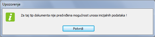 , u suprotnom će biti prikazana poruka da nije moguć unos inicijalnih podataka (vidi sliku)
