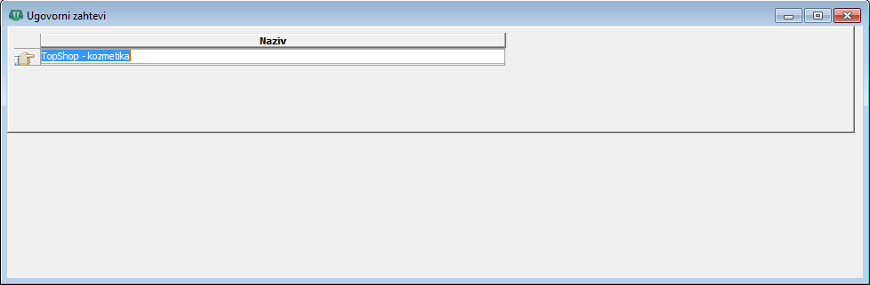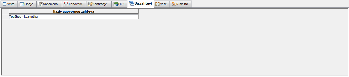 . Ugovorni zahtev se vezuje za vrstu dokumenta dodavanjem novog reda (CTRL+U). Ukoliko je potrebno definisati novi ugovorni zahtev, dvoklikom na polje "Ug.zahtevi" otvara se prozor "Ugovorni zahtevi" za unos novog zahteva (vidi sliku)
