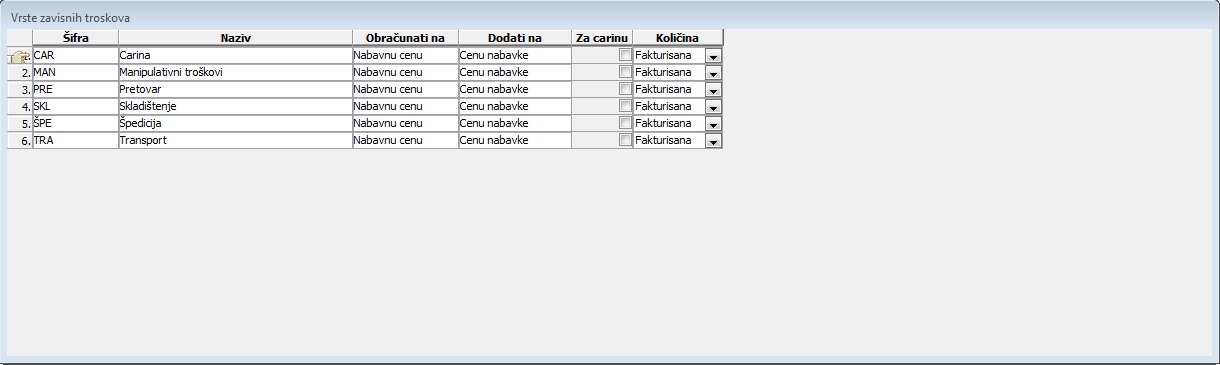 . U ulaznim kalkulacijama knjižna stavka "Zavisni troškovi pojedinačno" uključuje detaljno knjiženje definisano u prozoru za definisanje zavisnih troškova (vidi sliku)