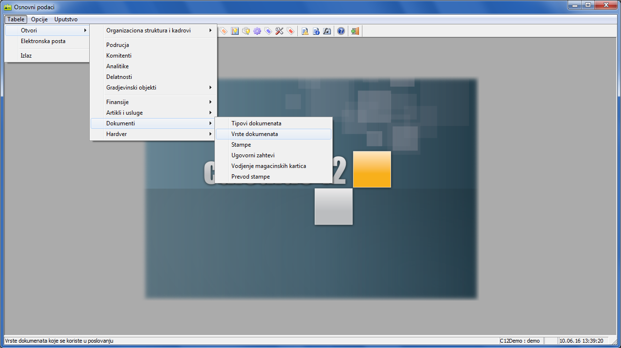 U glavnom meniju programa "Osnovni podaci" odaberite stavku "Tabele - Otvori - Dokumenti - Vrste dokumenata" ( vidi sliku )