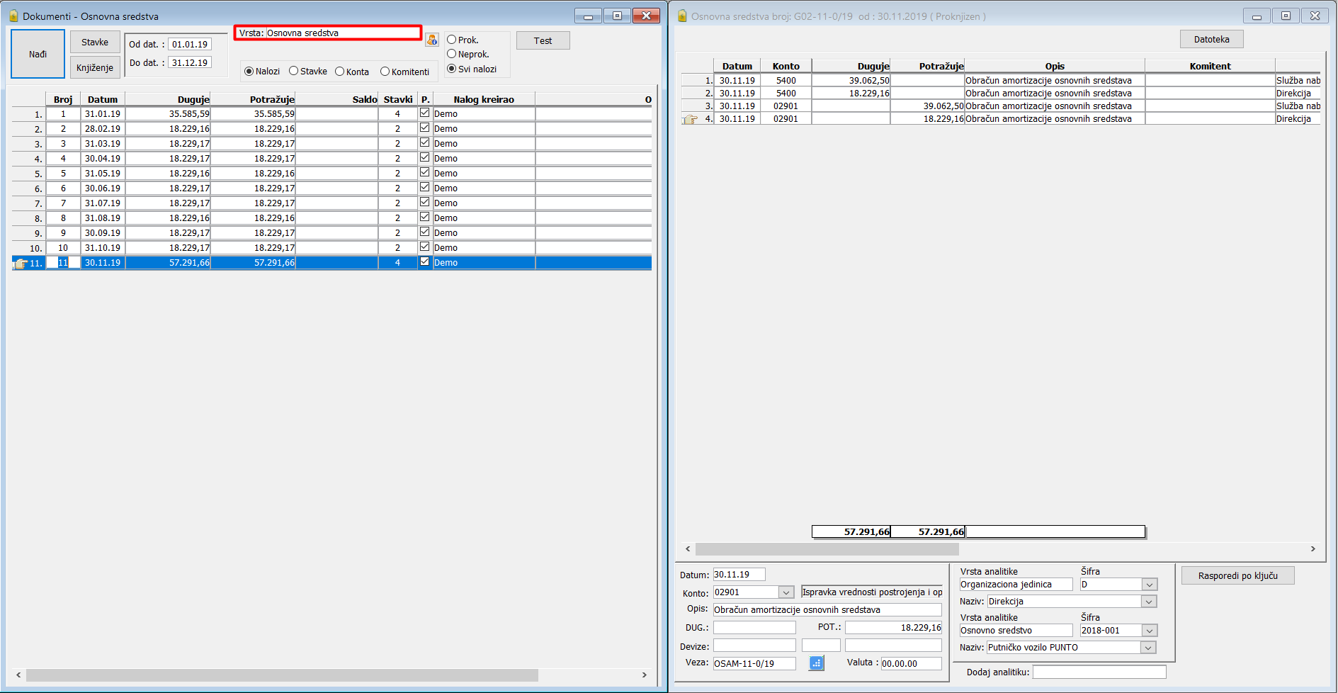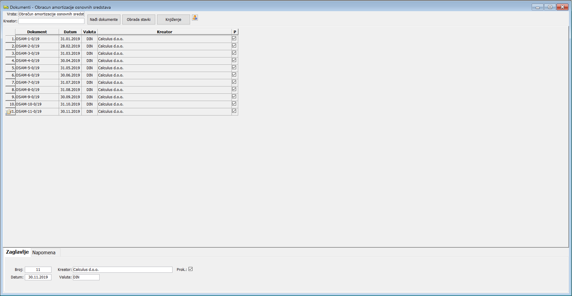 Ovim postupkom ste obračunali amortizaciju na poslednji dan u mesecu i kreirali dokument "Obračun amortizacije osnovnih sredstava" koji se nalazi u prozoru Dokumenti -> Otvori -> Nalog amortizacije.