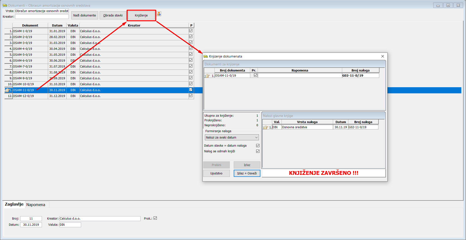 Selektujte nalog amortizacije koji želite da proknjižite u finansijsko knjigovodstvo, i kliknite na dugme "Knjiženje".