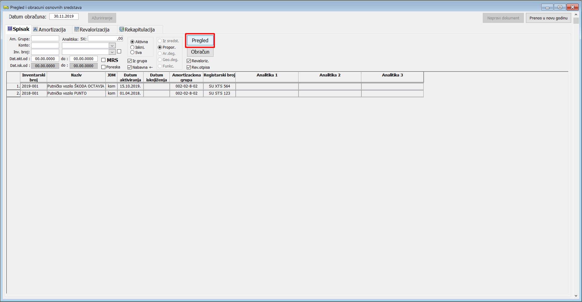 Da biste obračunali amortizaciju osnovnih sredstava otvorite prozor "Pregledi" izborom opcije iz glavnog menija Sredstva -> Pregledi. Unesite datum obračuna amortizacije osnovnih sredstava u polje "Datum obračuna:" OBAVEZNO na poslednji dan u mesecu i kliknite na dugme "Pregled i odmah zatim na dugme "Obračun". Posle klika na dugme "Obračun" postaje dostupno dugme "Napravi dokument.