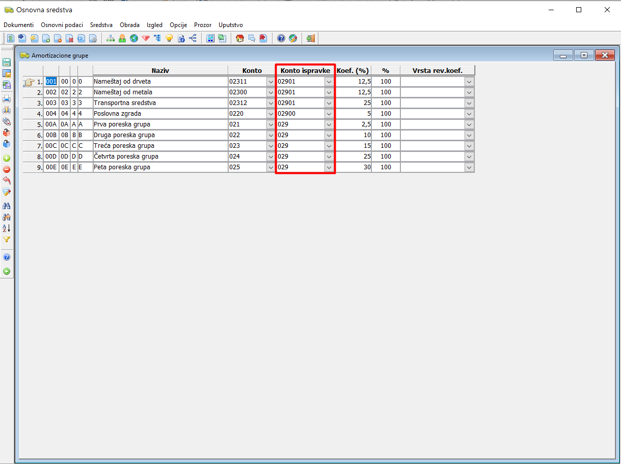 Amortizacione grupe - definisanje konta ispravke