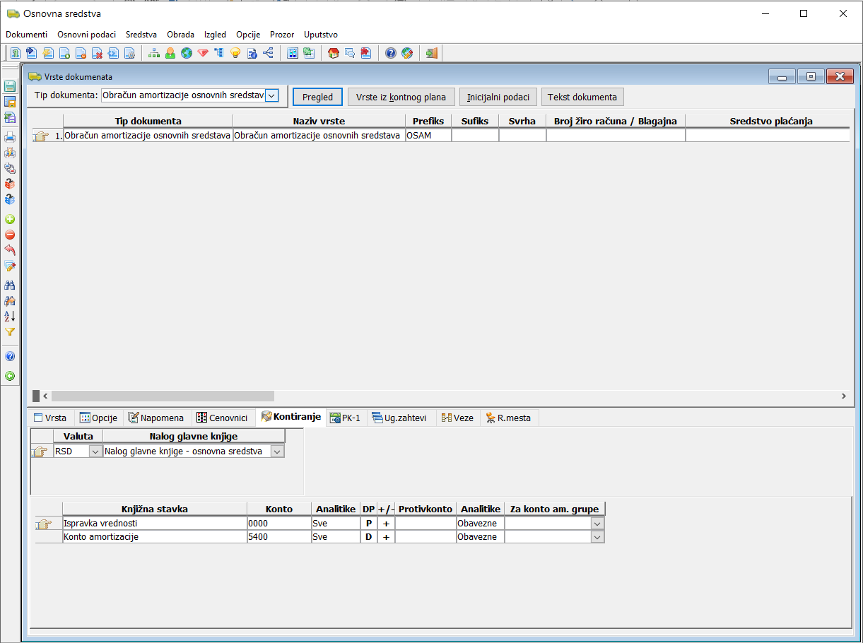 Otvorite prozor "Vrste dokumenata" iz glavnog menija Osnovni podaci -> Vrste dokumenata i za tip dokumenta "Obračun amortizacije osnovnih sredstava" i otvorite listić "Kontiranje". Kliknite na listić "Kontiranje". Pokažite kursorom na oblast sekcije za unos valute i naloga glavne knjige pa ubacite novi red. U kolonu "Valuta" unesite vrednost DIN, a u kolonu "Nalog glavne knjige" iz padajuće liste birajte registrator naloga glavne knjige u koji će biti kreiran nalog glavne knjige za knjiženje osnovnih sredstava. OBAVEZNO snimite promenu.