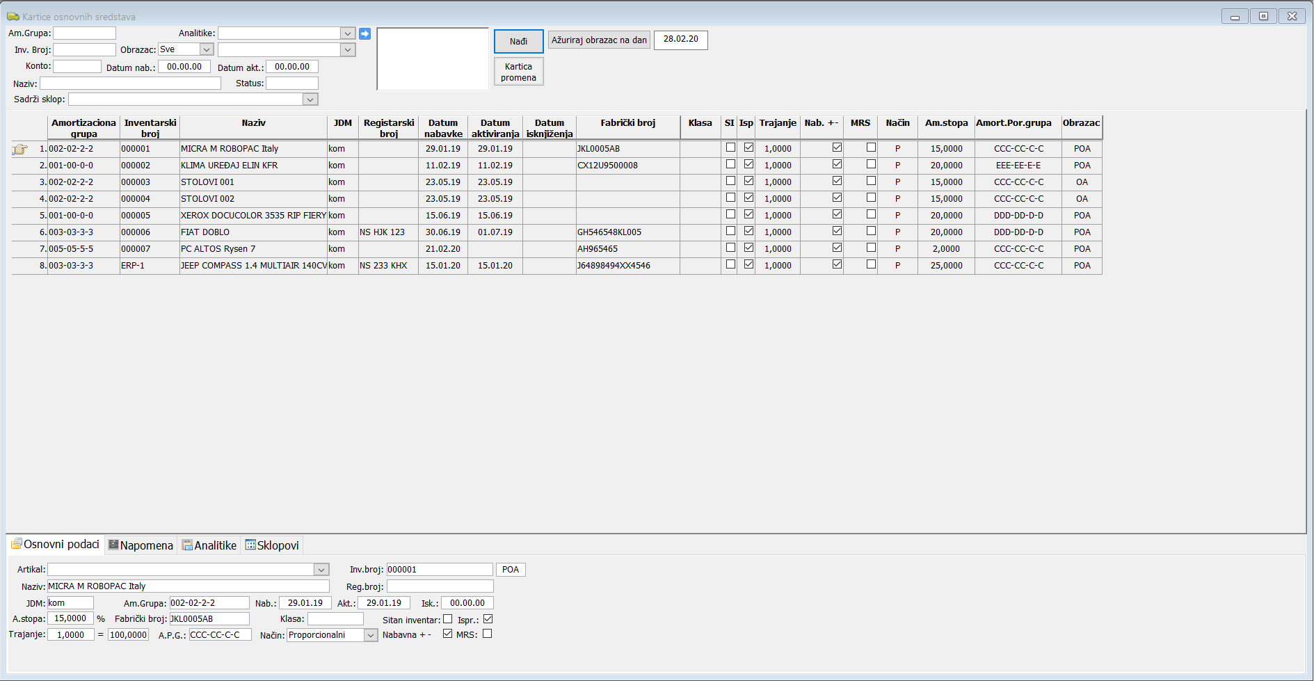 Ukoliko je konto amortizacije 5400 - Troškovi amortizacije analitički razvijen (raščlanjen), tada se svakom analitičkom kontu 5400X u koloni Za konto am. grupe dodaje odgovarajući konto amortizacije iz tabele "Amortizacione grupe".