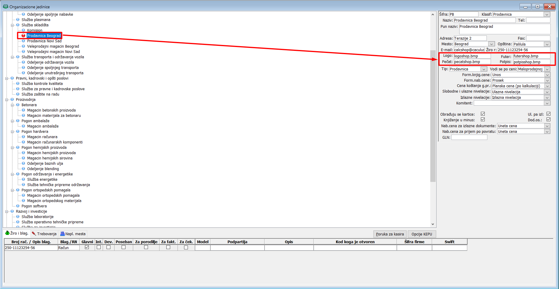 Otvorite prozor za unos i ažuriranje organizacionih jedinica Osnovni podaci - Organizaciona struktura firme, razgranajte strukturu klikom na korenu organicazionu jedinicu (desni klik - Razgranaj sve). U razgranatom stablu selektujte organizacionu jedinicu kojoj dodeljujete logo. Popunite polja Logo, Futer, Pečat, Potpis. Nazivi moraju biti jedinstveni, (vidi sliku)