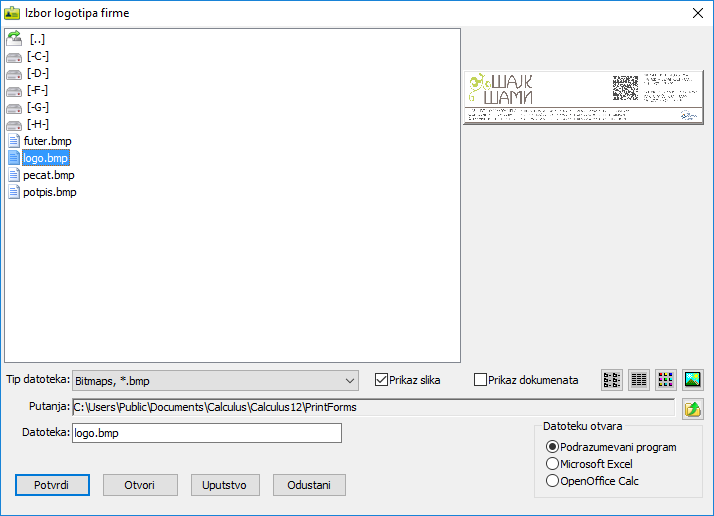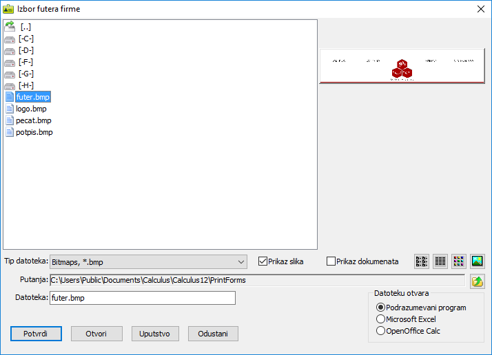 Za prijavu hedera programu kliknite na ikonicu fascikle polja Logotip preduzeća. U novootvorenom navigacionom prozoru kliknite na fajl sa nazivom logo.bmp, zatim na taster Potvrdi (vidi sliku)