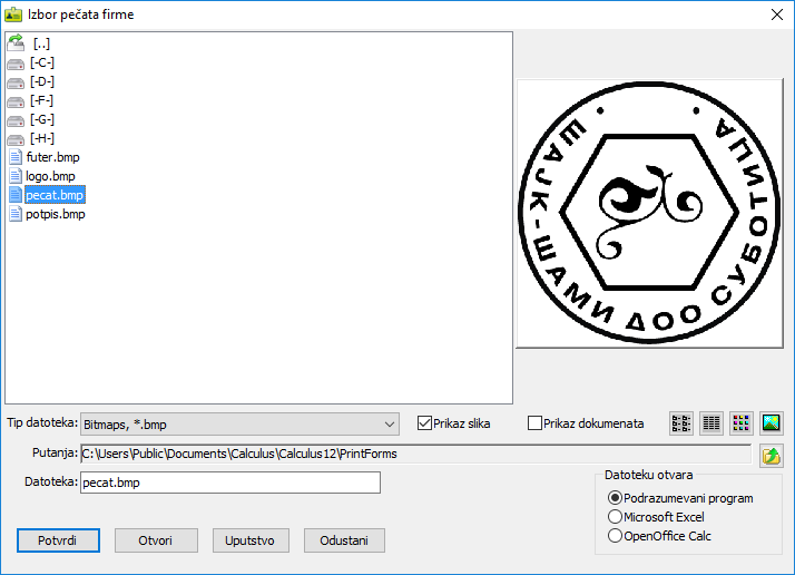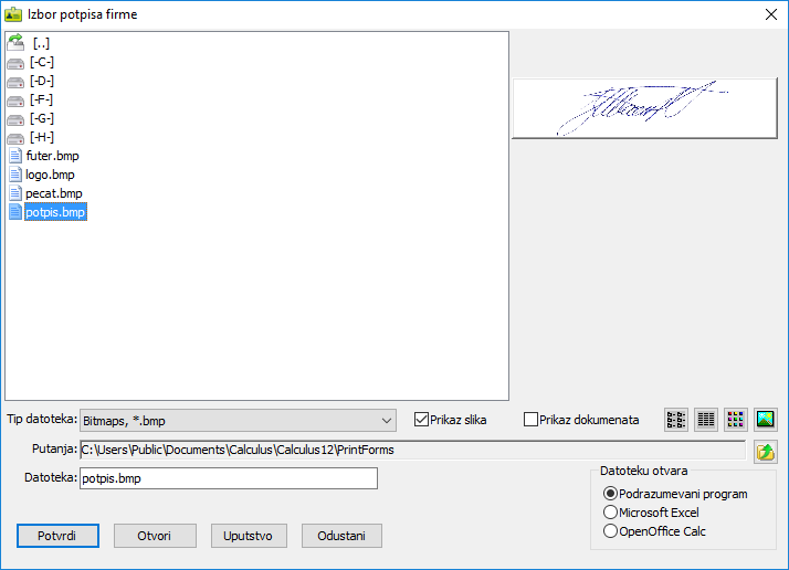 Za prijavu potpisa programu kliknite na ikonicu fascikle polja Potpis preduzeća. U novootvorenom navigacionom prozoru kliknite na fajl sa nazivom potpis.bmp, zatim na taster Potvrdi (vidi sliku)