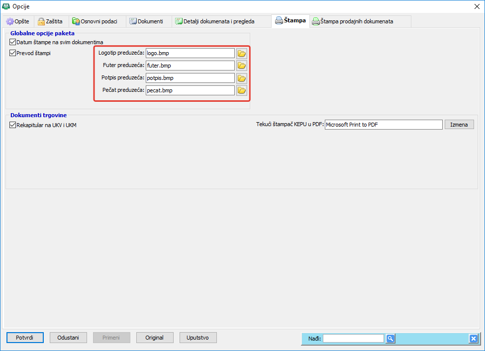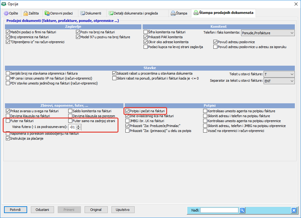 Sada u istom dijalog prozoru "Opcije programa..." birajte listić "Štampa prodajnih dokumenata ". U okviru ovog listića podešavaju se opcije štampi i izgleda štamanih dokumenata prodaje. Potvrdite opcije za prikaz futera, pečata i potpisa po želji. Po završenom poslu kliknite na taster Primeni i zatim na taster Potvrdi (vidi sliku)