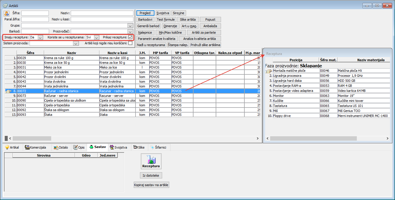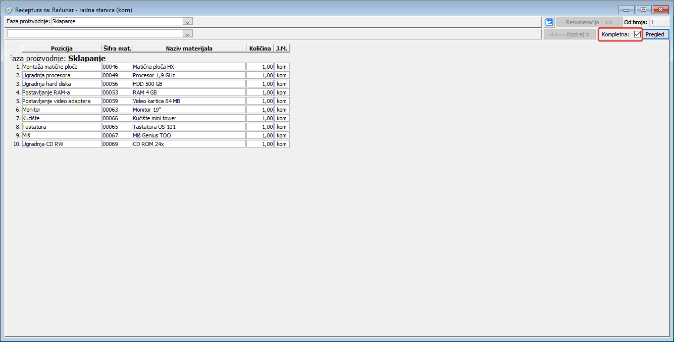 . Potvrđivanjem opcije "Kompletna" videće se kompletna receptura, odnosno biće zbirno prikazane sve pozicije artikla (proizvoda) ( vidi sliku )