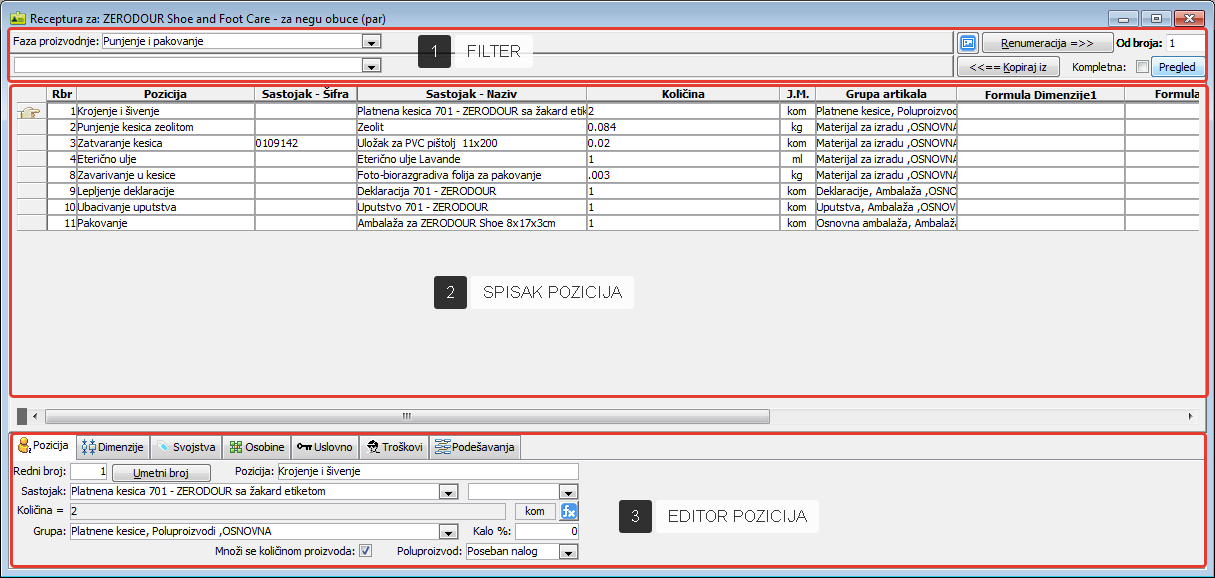 Prozor za unos pozicija i repromaterijala "Receptura za: (naziv artikla)" sastoji se iz tri oblasti, filtera, liste proizvodnih pozicija i editora pozicija (vidi sliku)