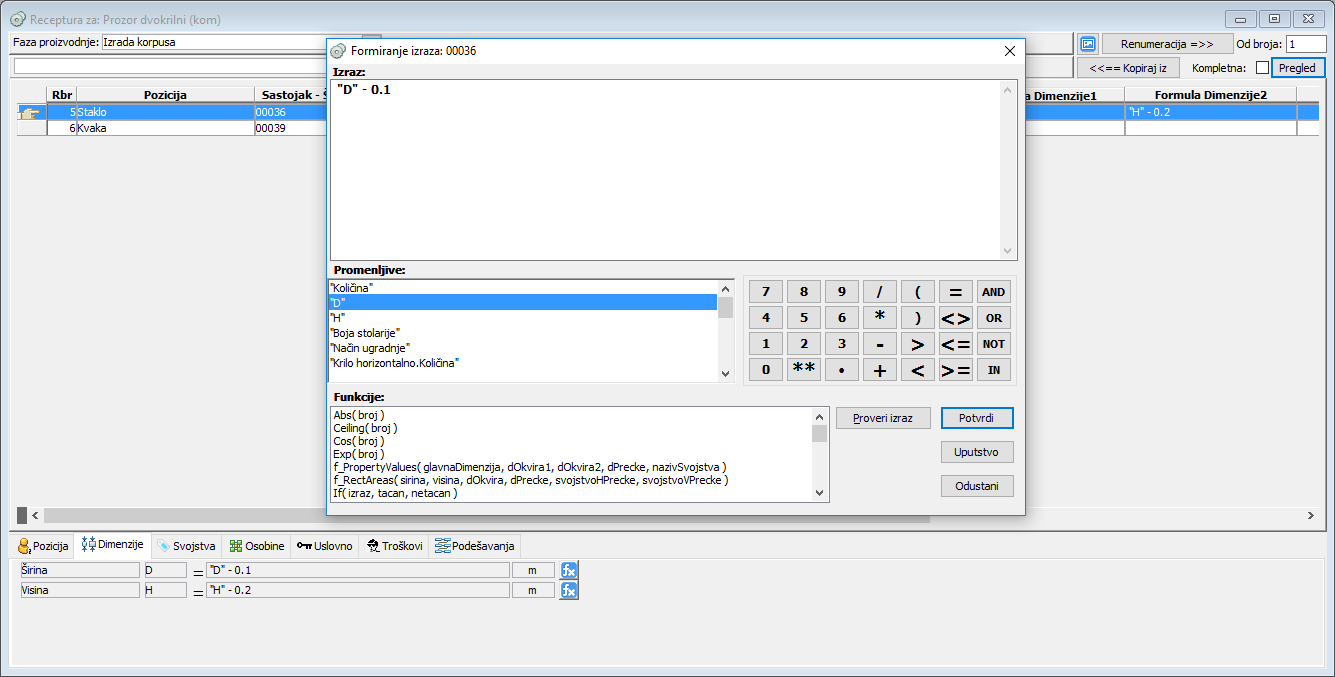 U listić "Dimenzije" unosite formule na osnovu kojih će se u radnom nalogu obračunati dimenzija za selektovanu poziciju. Ovu formulu za izračunavanje dimenzija pozicije moguće je sastaviti i na osnovu količina, dimenzija i svojstava gotovog proizvoda i/ili ostalih pozicija (vidi sliku)