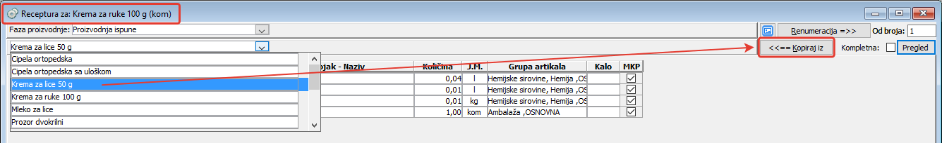 Ukoliko već postoji slična receptura onoj koju nameravate formirati, može te je jednostavno formirati kopiranjem neke slične recepture a zatim izvršiti samo neophodne izmene. Iz padajuće liste polja "<<== Kopiraj iz" birajte artikal čiju će te recepturu kopirati. Kliknite na dugme " <<== Kopiraj iz " kako biste pokrenuli proceduru kopiranja. Nakon kopiranja dodajte nove pozicije ili izmenite sastav recepture za pojedine pozicije ( vidi sliku )