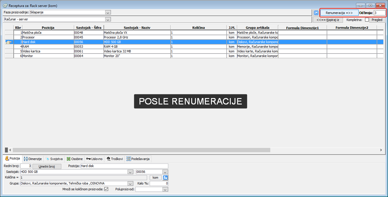 Selektujte poziciju od koje želite renumeraciju i u polje "Od broja:" navedite redni broj od kojeg želite da se pozicije renumerišu i kliknite na dugme "Renumeracija ==>>".